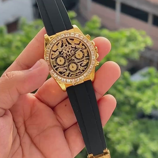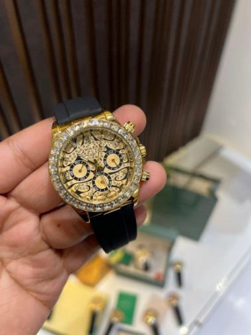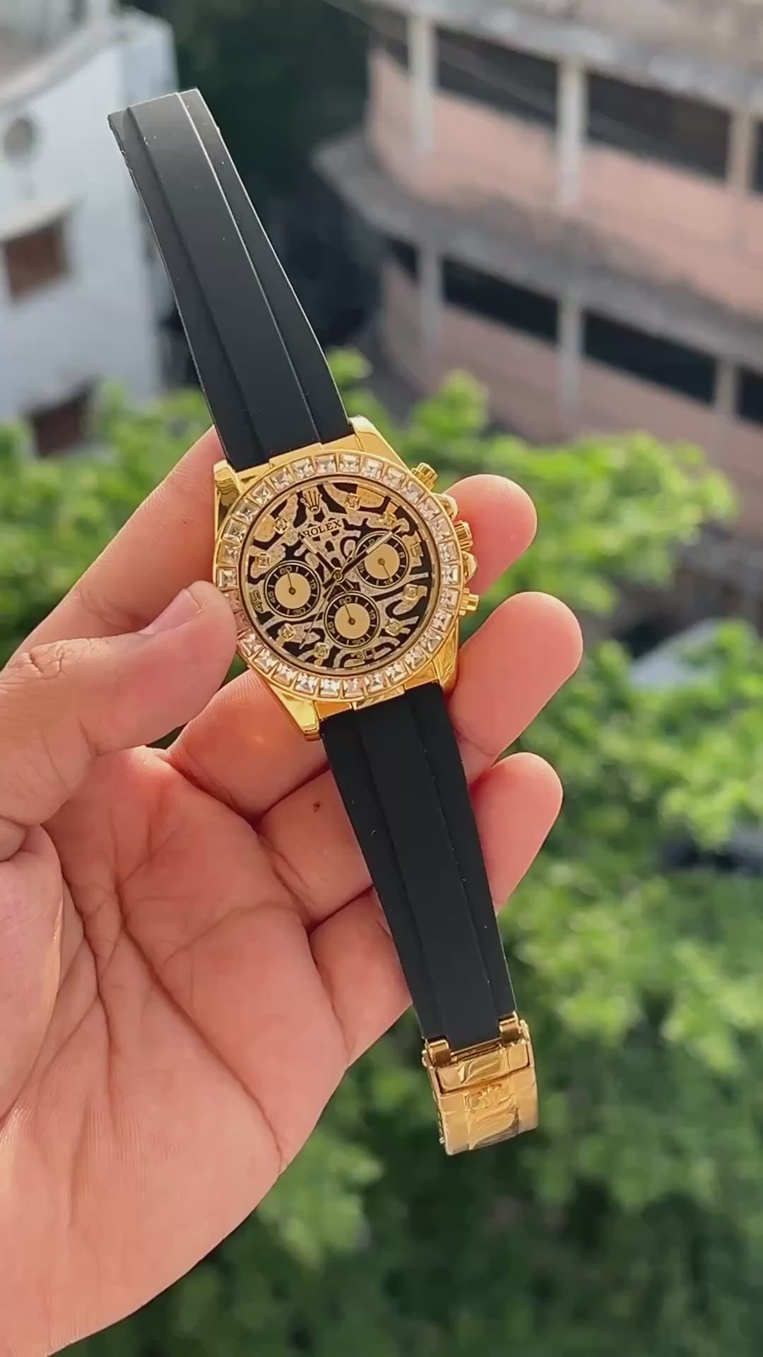 Step up your style with this luxury quartz chronograph watch, designed for those who love precision, performance, and pure class. Featuring fully working chronographs, a stunning golden dial with diamond accents, and a comfortable silicon strap, this timepiece is the definition of modern elegance.